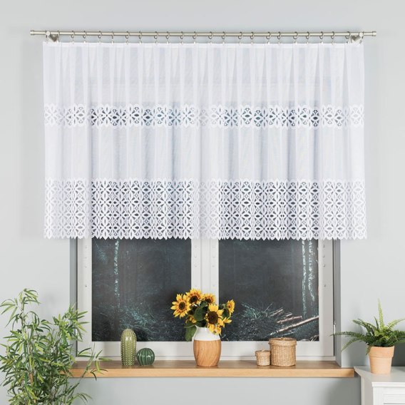 Firanka jest gotowa do zawieszenia, co ułatwia szybkie udekorowanie okna. Zapewnia prywatność, a jednocześnie przepuszcza naturalne światło, nadając wnętrzu subtelnej świeżości.