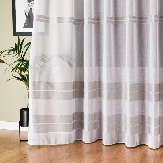 Firanka fantazyjna ze wzorem na samym dole z ołowianką, wysokość 300cm, kolor 032 biały z szarymi pasami 019355/OLO/032/000300/1