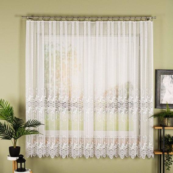 Firanka wykonana jest z wysokiej jakości 100% poliestru, co zapewnia trwałość, odporność na zagniecenia i łatwość w pielęgnacji. Klasyczna biel w połączeniu z subtelną aplikacją wprowadza do wnętrza harmonię i elegancję, sprawiając, że okna zyskują wyjątkowy urok.