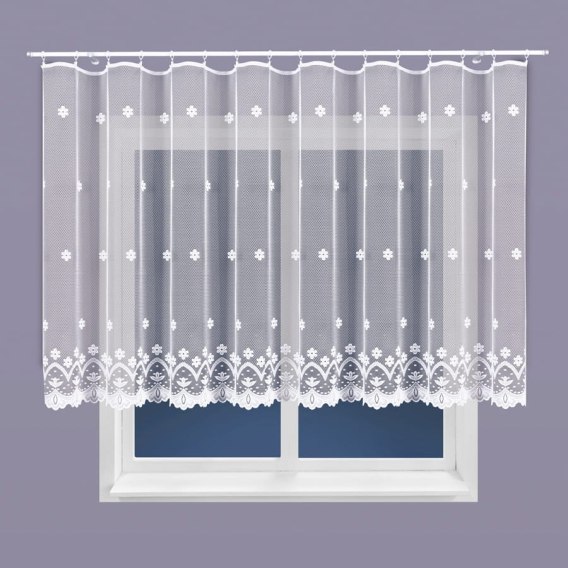 Firanka żakardowa 004421 o wysokości 150 cm sprawdzi się w salonie, sypialni, kuchni czy pokoju dziennym. Lekka, półtransparentna tkanina przepuszcza naturalne światło, tworząc przyjemną atmosferę, a jednocześnie zapewnia prywatność. Uniwersalny biały kolor i subtelny wzór kwiatowy pasują zarówno do wnętrz klasycznych, jak i nowoczesnych.
