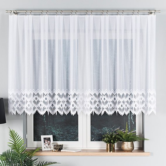 Firanka żakardowa 018989 o wysokości 120 cm to doskonałe rozwiązanie do niższych okien, kuchni, łazienek lub wnętrz, w których zależy Ci na lekkiej i subtelnej dekoracji. Jej klasyczny biały kolor sprawia, że idealnie komponuje się z różnymi stylami aranżacyjnymi.