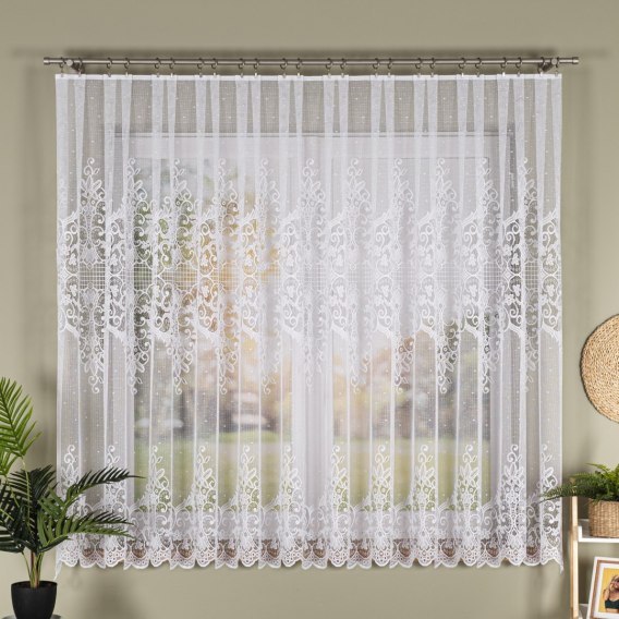 Firanka żakardowa 019461 została wykonana z trwałego poliestru, który nie odkształca się i nie traci koloru nawet po wielokrotnym praniu. Materiał jest lekki, odporny na działanie promieni słonecznych, co pozwala utrzymać śnieżnobiały odcień przez długi czas. Firankę można prać w niskiej temperaturze, a po rozwieszeniu schnie szybko i nie wymaga prasowania.