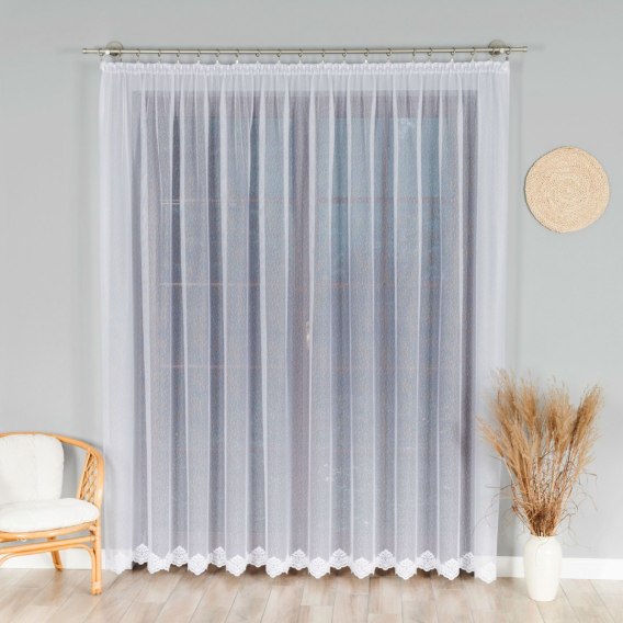 Firanka 023405 doskonale komponuje się z zasłonami, roletami lub może stanowić samodzielną dekorację okna. Biały kolor pasuje do każdego stylu wnętrza – od klasycznego, przez skandynawski, po nowoczesny, co czyni ją ponadczasowym wyborem.
